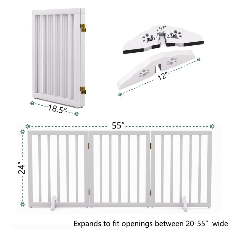 Dog Gates for The House Freestanding Folding Pet Gate Indoor 3 Panels 24'' Height with 2PCS Support Feet Wooden White Dog Gate for Stairs Extra Wide Dog Gate
