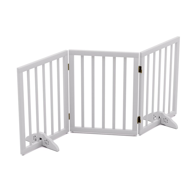 - STYLISH INDOOR DOG GATE FREESTANDING:Made of high quality MDF, the folding dog gate has a sleek modern style and a chic white finish that is sure to complement any decor. This stylish pet gates for dogs will block kitchen doorways, bedroom doorways, front doorways, hallways and staircases in your home and looks great with your modern home furniture