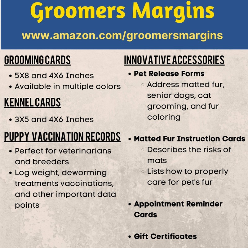 - Consistent branding: Each of our Groomers Margins products are consistent in our wavy paw print style: Matted Fur Instruction Cards, Dog Groomer Report Cards, Gift Certificates, Appointment Reminder Cards and Grooming Pet Release Forms
