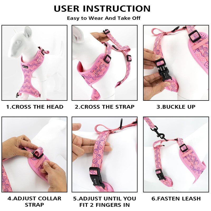 - 【Fully Adjustable Collar & Chest Strap】This adjustable no pull harness features 3 easy adjusting straps around the body. You can use its 2 neck straps and 1 chest straps to create a perfect fit for your dog with some room for growth. No worries about slipping out or choking.Just enjoy the freedom time while walking, running, shopping and training.