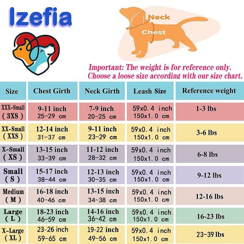 Izefia dog harness is made of Cotton & Polyester fabric, warm, comfortable, delicate and soft, safe and skin-friendly for pets. and there comes with zinc alloy buckle, sturdy and durable for using a long time.