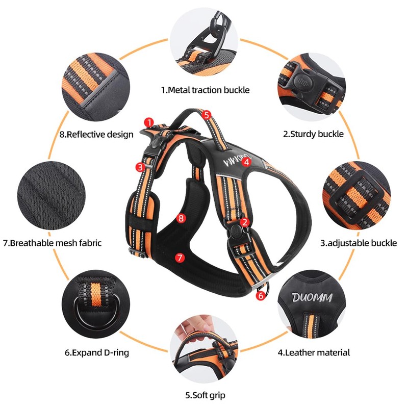 The dog harness for large dogs without pull with unique 4 quick release design that allows you to put it on from the side of the dog's neck instead of the head. This way of dressing can effectively reduce the dog's resistance and help you put it on or take it off quickly