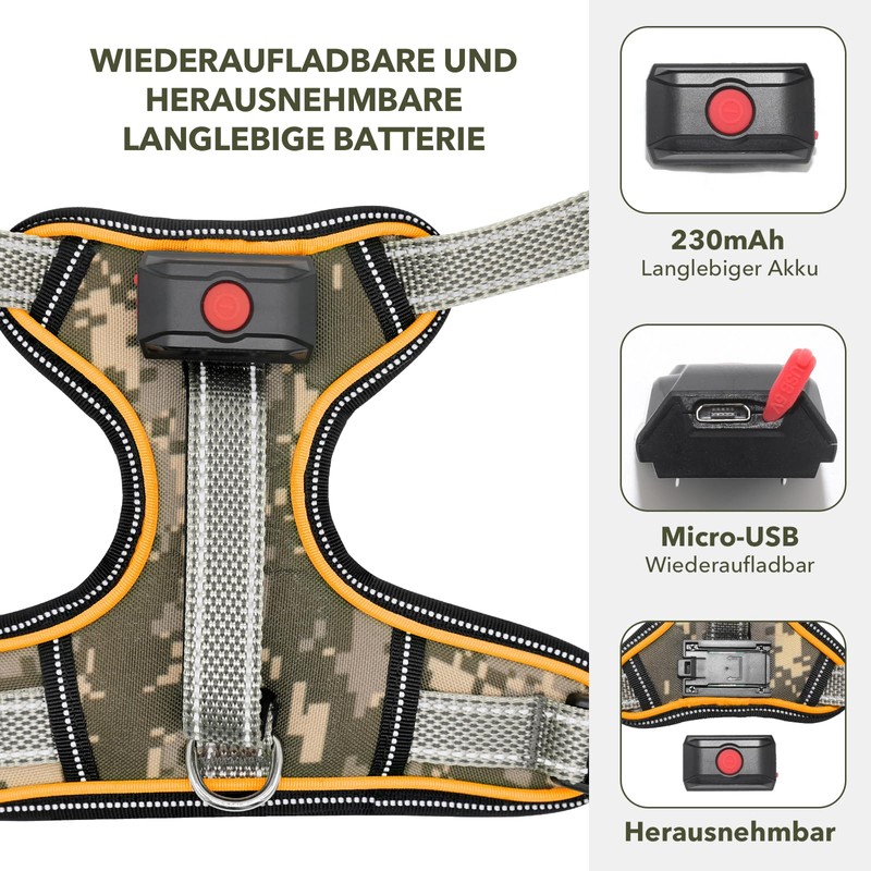 - A light harness for dogs, developed by our engineers especially for the German market, quickly gained great popularity after a successful start in the USA. Now we have optimised it and bring this unique tableware to the German market to meet the needs of German consumers. It uses unique light guide technology and fashionable camouflage fabrics, which makes it unique on the German market.