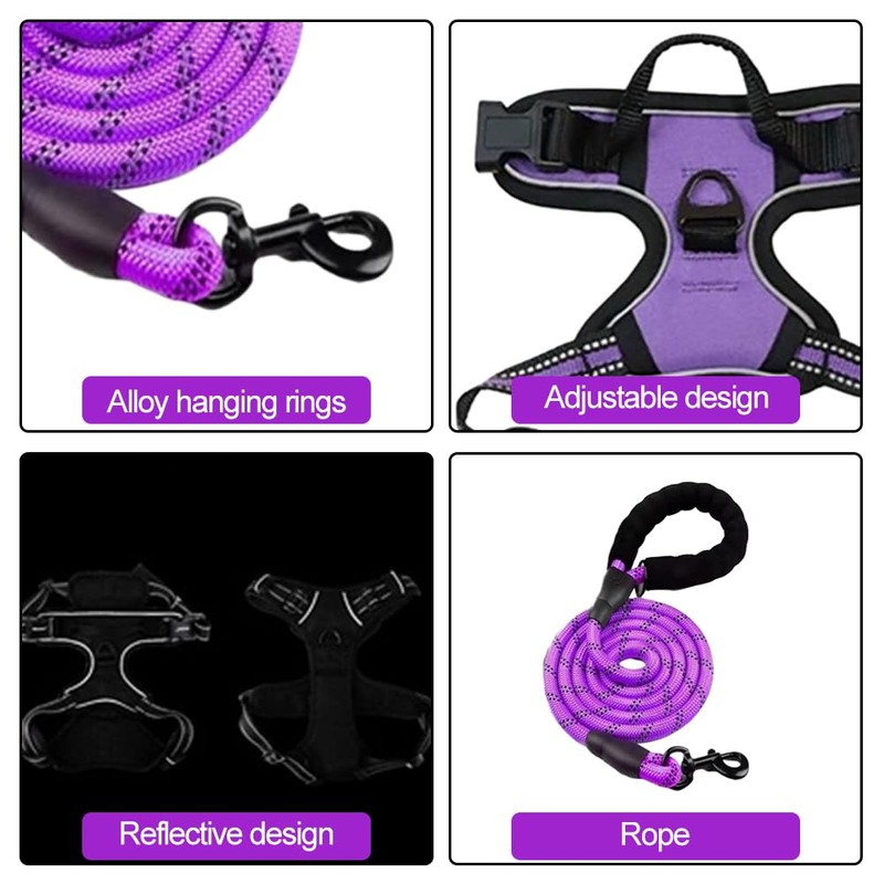 Purple Dog Harness and Nylon Leash Set (2-Pack) - No Pull Reflective Vest for Small/Medium/Large Dogs, Adjustable Breathable Escape Proof Design for Training Walking Hiking