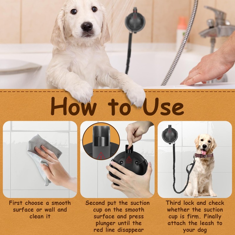 - [Premium Material] Made of premium rubber and nylon, the powerful dog bathing suction cup and high elasticity leash tether are reusable, soft to touch and stand the wear and tear. The leash tether can be extended to a great distance. It is an ideal tool to make the dog stand comfortable and help control excessive movement of overexcited pets