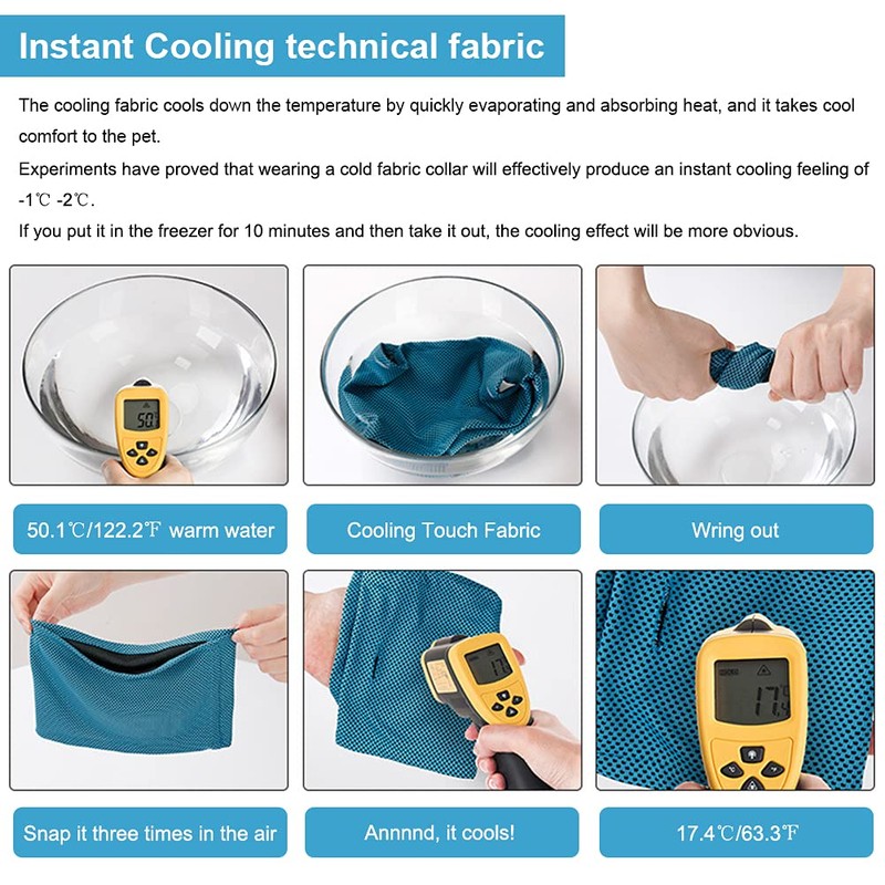 - 【Simple to Use】Soak the neck scarf with water, wring it out fully, then put it on your dog. For the cooling effect more obvious, you can wring it out and put it in the refrigerator for 10 minutes. Special cooling technologies make it more convenient for dogs to enjoy cool.