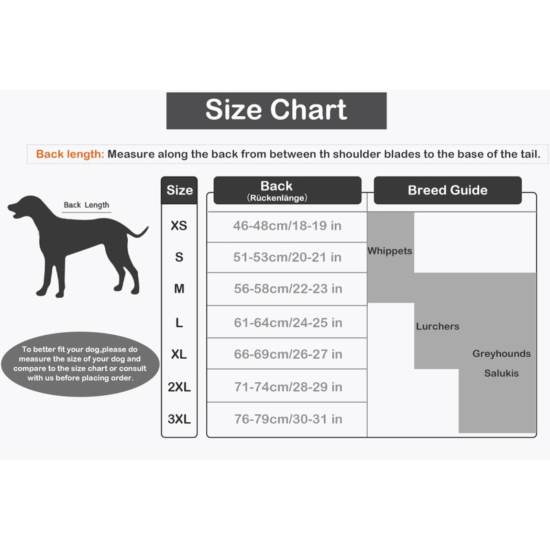 Note: If your dog is a large chest, long hair, or at the high end of the size, you may order the next larger size to ensure a comfortable fit.