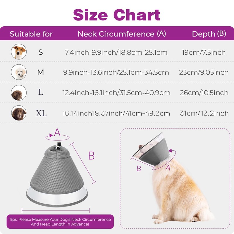 - Selection of size: S:7.4inch-9.9inch/18.8cm-25.1cm;M:9.9inch-13.6inch/25.1cm-34.5cm;L:12.4inch-16.1inch/31.5cm-40.9cm;XL:14.8inch-18. 5 inch/37.6 cm-47 cm. But please note that before you buy, please measure our pet neck circumference and choose the right size to ensure it fits.