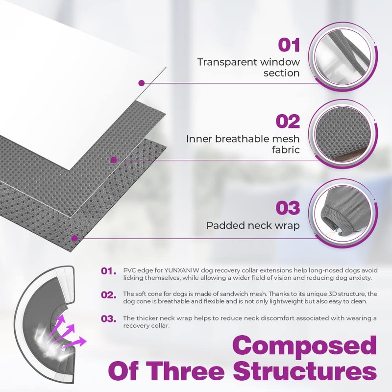 - This dog collar after surgery, combined with the advantages of other products on the market, innovative design of comfortable and breathable cotton base and transparent window part, which allows dogs to wear dog recovery collar comfortably at the same time, have a better view.