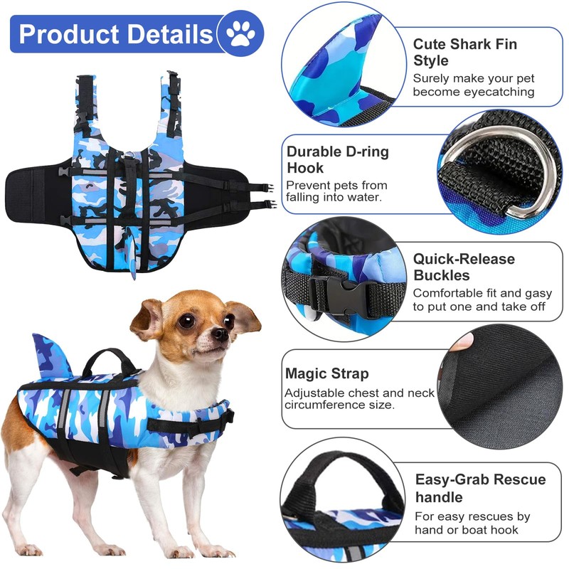 - UNIQUE CUTE SHARK FIN : FANUPSON dog life jacket featuring a unique charming shark fin design dresses up your puppy as a cute shark; Fun shark shape and bright colors to provide higher visibility in the water.The best life jackets with high buoyancy are perfect for pool parties, beach trips or boat trips.
