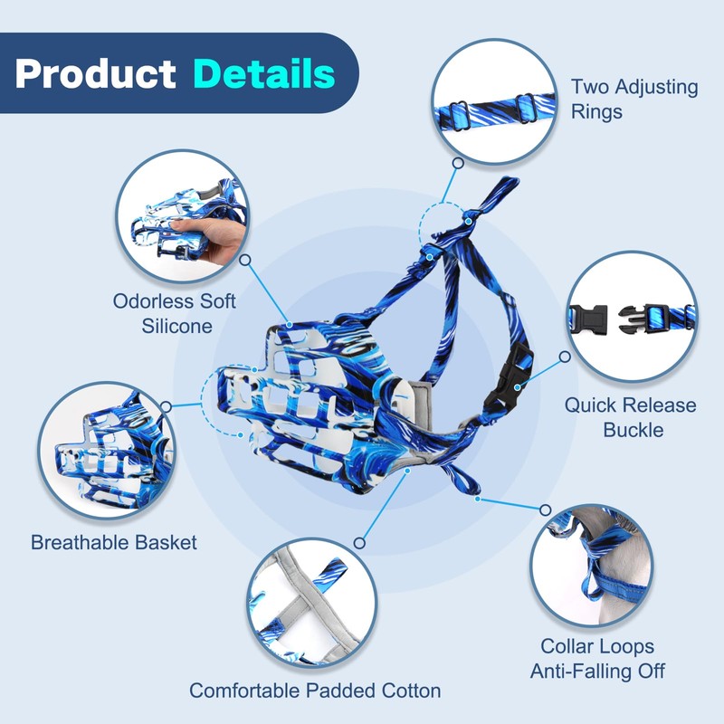 - Material Advantages: Our basket muzzles is made of upgrade silicone material which is long-lasting rub, bite resistance, and no pungent odor. Additionally, the appropriately soft dog silicone muzzle with cotton padded lining strap for added c is comfortable for dogs' skin and will not rub the dog's nose. Unique printing technology, the appearance is different from the traditional basket dog muzzle, making your dog more attractive on the street