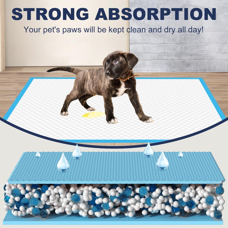 - 【LEAK-PROOF PROTECTION】Each dog training pads has a thick PE film as the final layer, durable and resistant to tearing and scratching. It can effectively prevent leakage to protect your floor, carpet, sofa, chair, bed, seat, etc. from urine damage