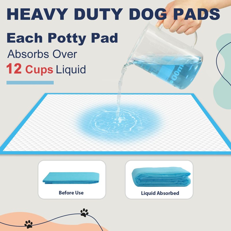 - 【STRONG ABSORBENT】Each wee wee pad contains imported polymers and fluff slurry, which can quickly turn liquid into gel, and lock in up to 10-12 cups of liquid. Pets won't dirty your floor with wet paws anymore