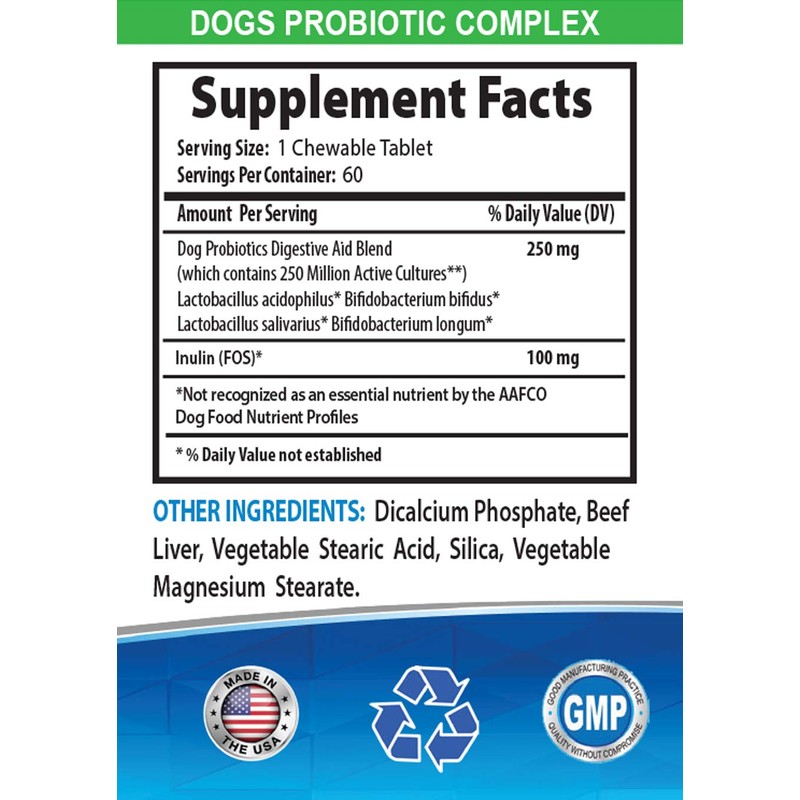 DOGS NATURAL PROBIOTIC FORMULA: There isnt one strain of probiotics that will help a dog by itself. Our natural supplement is made of Lactobacillus acidophilus and Lactobacillus salivarius which contains 250 million active cultures that can benefit your dogs health like nothing else. We also included Inulin(FOS) which also has amazing benefits for your dog.
