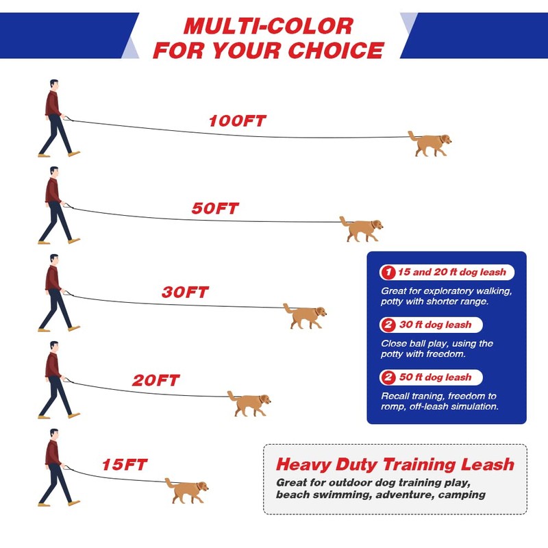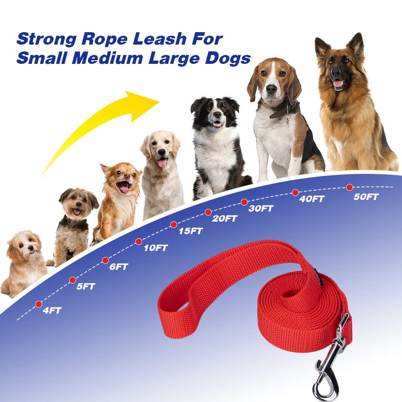 - 【Multi-choice】Traning Ropes are 20mm wide, eight different length for your choice according to your different training purposes. 15ft and 20ft long for exploratory walking; 30ft long for Close Ball Play; 50ft long for Recall traning, freedom to romp and off_leash simulation.