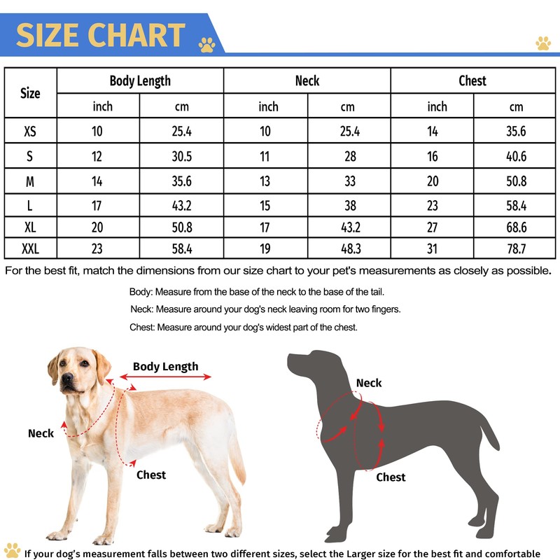 - For the best fit, match the dimensions from our size chart to your pet's measurements as closely as possible. Body: Measure from the base of the neck to the base of the tail. Neck: Measure around your dog's neck leaving room for two fingers. Chest: Measure around your dog's widest part of the chest. If your pet is in between two sizes, we advise ordering the larger size dog rain poncho for the best fit and comfortable. Thank you.
