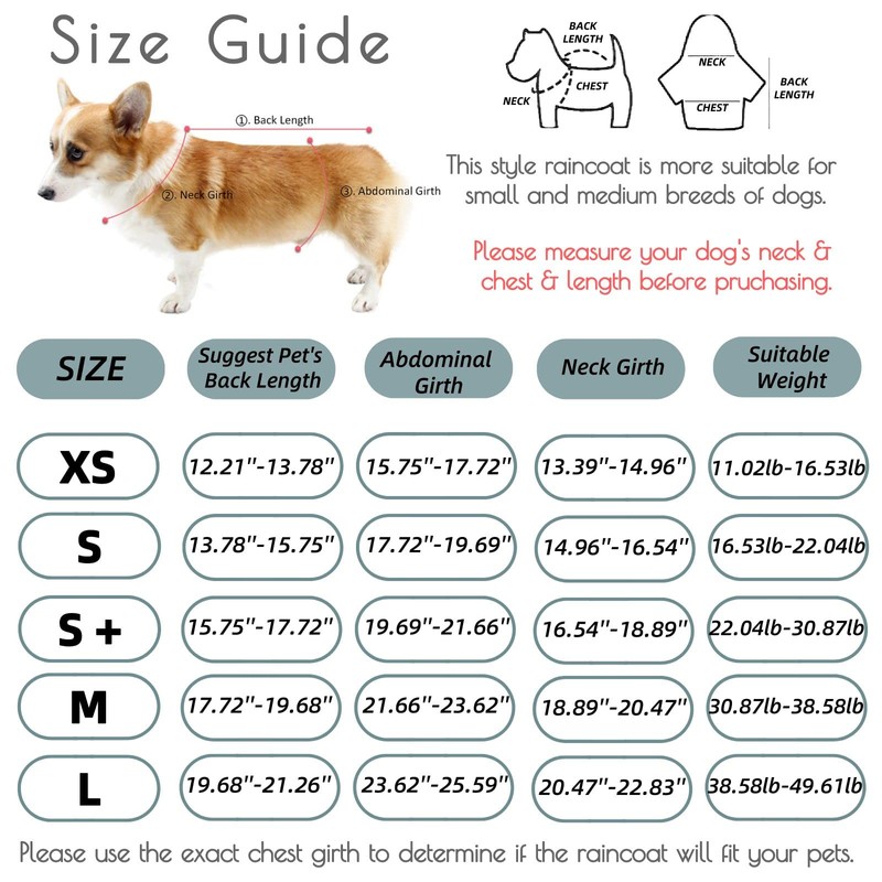 - 【Waterproof fabric】 Carefully crafted from Imitation leather waterproof coating to keep dog dry while walking in the rain. The lightweight material will let your dog enjoy the rain when wearing this dog rain coat