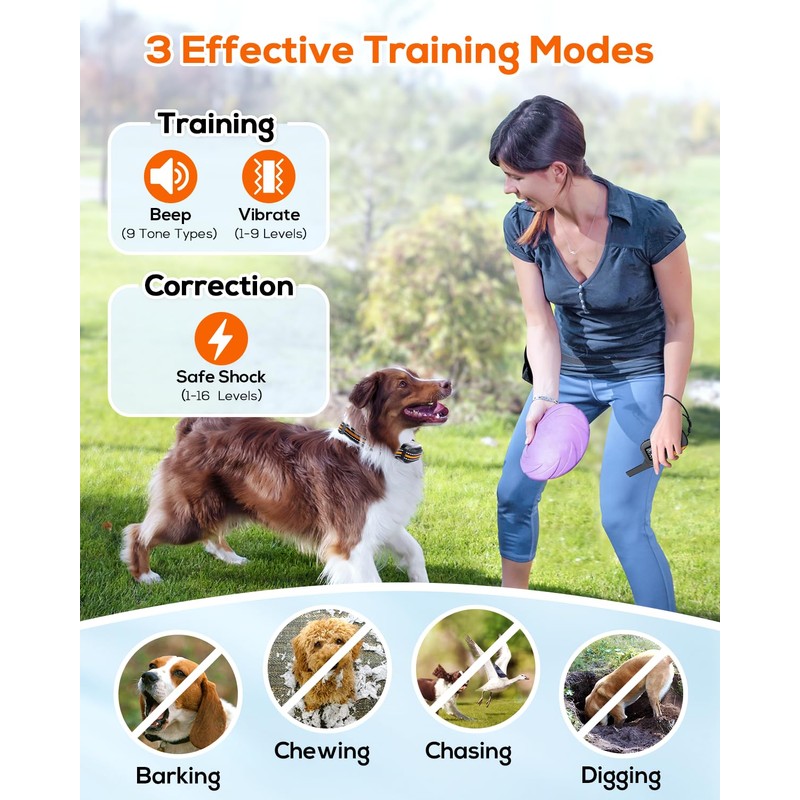 - ๐๐ก๐ซ๐๐ ๐๐จ๐๐๐ฌ ๐๐จ๐ซ ๐๐ฎ๐ฆ๐๐ง๐, ๐๐๐๐, ๐๐ง๐ ๐๐๐๐๐๐ญ๐ข๐ฏ๐ ๐๐ซ๐๐ข๐ง๐ข๐ง๐ : Our dog training collar offers three training modes: Beep (9 tone types), Vibration (1-9 levels), and Safe Shock (1-16 levels). This allows you to adjust the stimulation level according to your pet's temperament, effectively correcting bad behaviors while ensuring a humane and safe training experience.