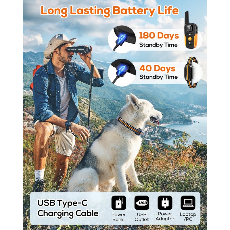 - ๐๐ฆ๐ฉ๐ซ๐๐ฌ๐ฌ๐ข๐ฏ๐ ๐๐๐ญ๐ญ๐๐ซ๐ฒ ๐๐ข๐๐ ๐ฐ๐ข๐ญ๐ก ๐๐ฎ๐ข๐๐ค ๐๐ก๐๐ซ๐ ๐ข๐ง๐ : Charging via USB-C, the dog training collar and remote offer an exceptional battery life. The collar can last up to 40 days on standby, while the remote lasts 180 days. With its 2-in-1 fast charging feature, it only takes 2 hours to fully charge, ensuring uninterrupted training sessions during camping or other outdoor activities.