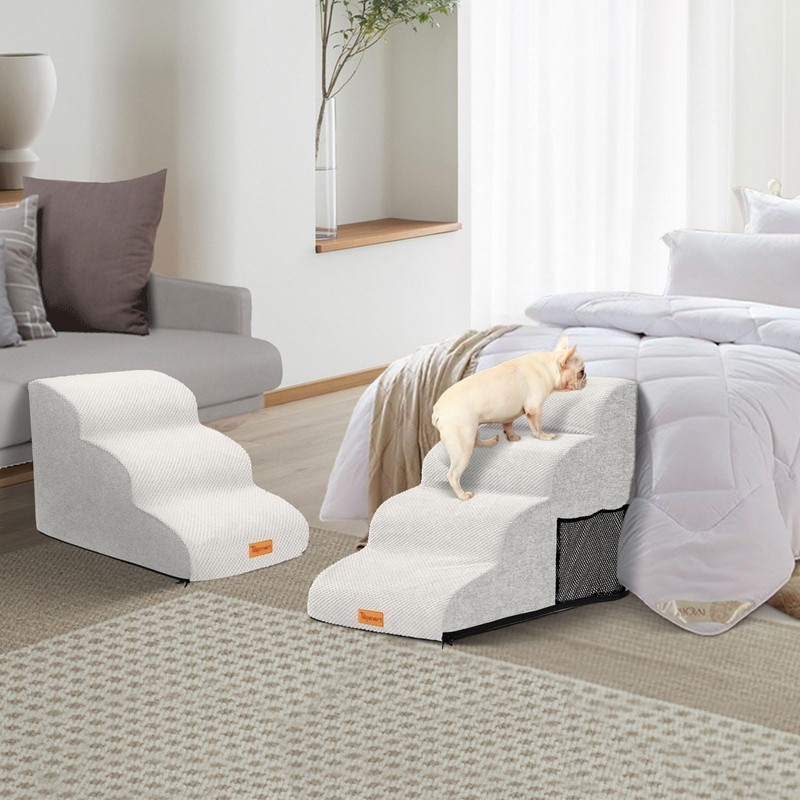 Dog Stairs for Small Dogs,4-Step,Foam Dog Steps&Ramps for Couch/High Beds with Waterproof &Removable Cover, Non-Slip, White