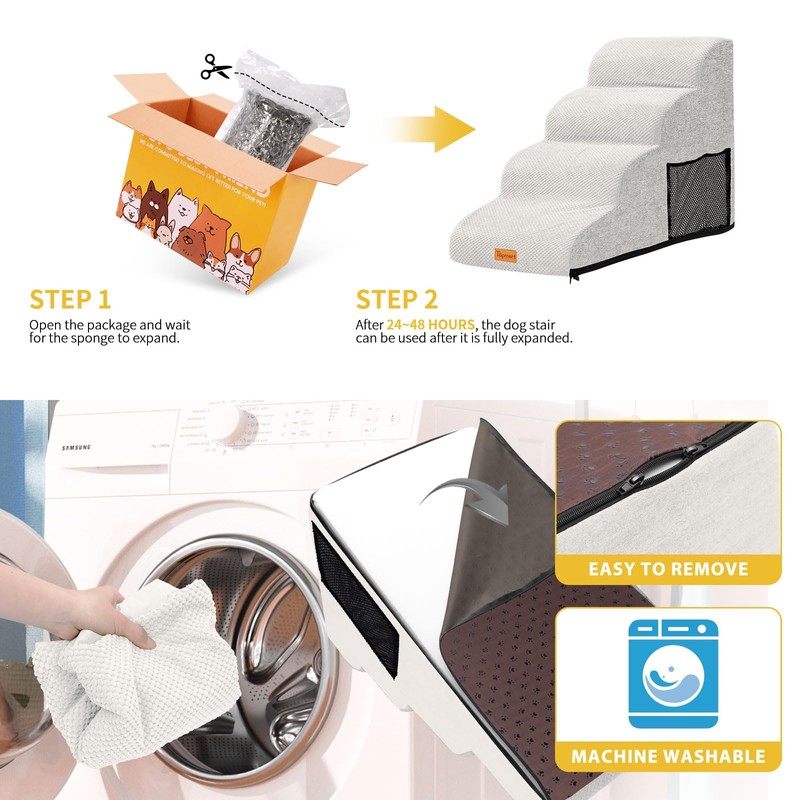 - 【REMOVABLE AND MACHINE WASHABLE】 The cover of the dog ramp can be easily removed with a sealed zipper. The cover is machine washable, simply remove the sponge and put the cover in the washing machine. This can effectively save your washing time.
