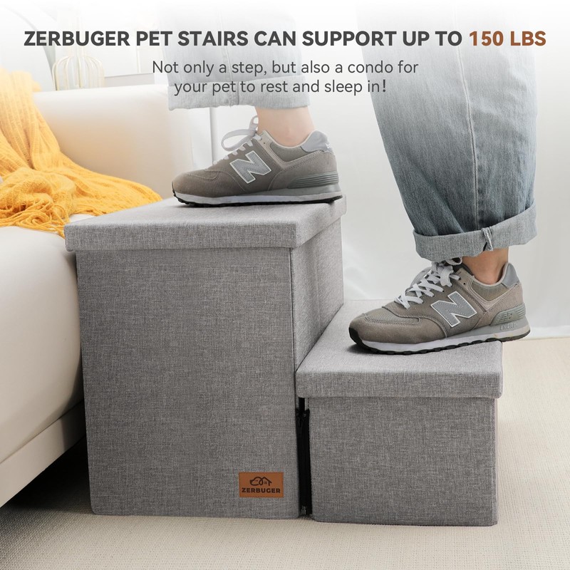 - MORE STABLE AND COZY: Zerbuger dog stairs are made of MDF and include foam, which relieves pressure on pets' paws and joints. Our pet steps are perfect as a warm GIFT for you hurt, disabled and elderly dogs. The removable board pads are placed inside to ensure that the pet steps are stable enough without any wobbling. The non-slip bottom ensures that the pet steps don't move. The dog stairs can support up to 150 LBS.