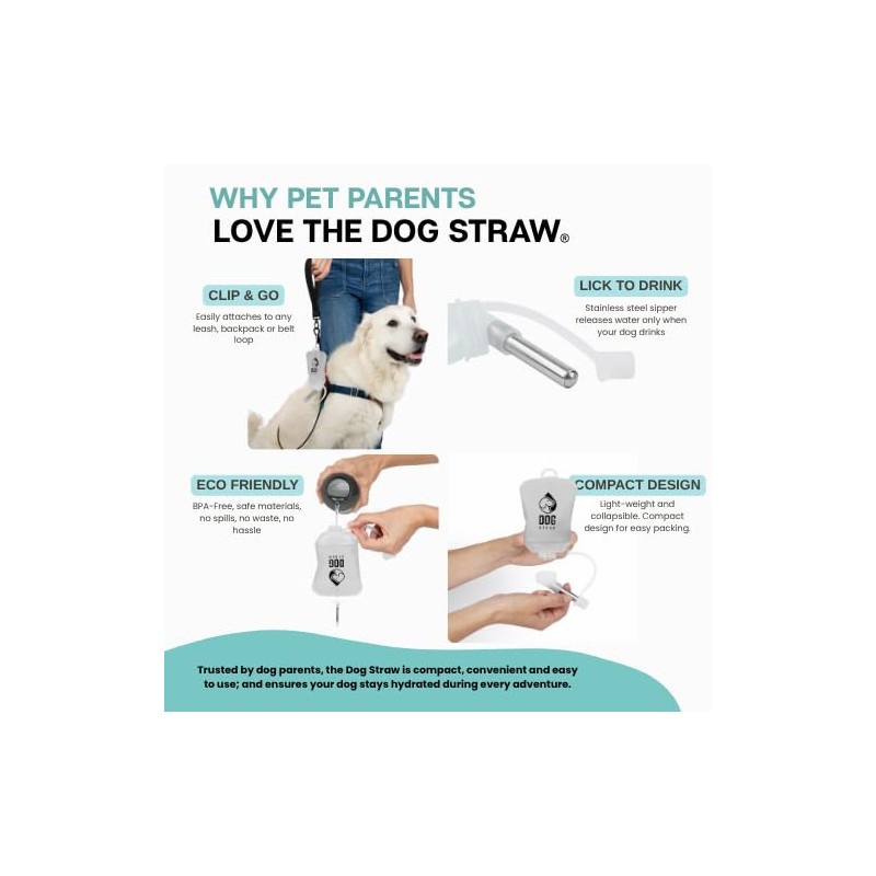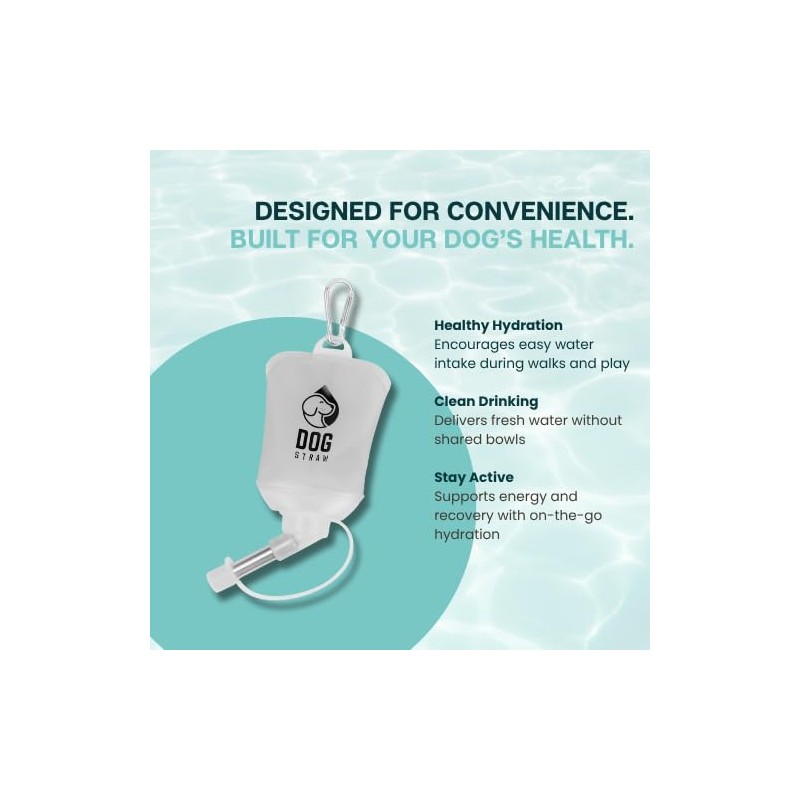 Dog Straw – Portable Dog Water Dispenser | Leak-Proof Stainless Steel Sipper | BPA-Free Collapsible Pouch | Clips to Leash or Bag | Travel Hydration for Dogs Dog Straw is the easiest way to keep your dog hydrated on the go—without the mess or bulk of traditional bowls and bottles. Designed by dog owners, this lightweight hydration tool combines a collapsible, BPA-free silicone water pouch with a stainless steel sipper nozzle. The innovative lick-activated design releases water only when your dog needs it, eliminating spills and wasted water. Perfect for walks, hikes, road trips, and travel, Dog Straw clips easily to a leash, backpack, or belt loop for hands-free convenience. The soft pouch shrinks as your dog drinks, reducing slosh and saving space, and the included twist cap prevents leaks when not in use. Built with durable, food-safe materials, Dog Straw is odor-free, easy to clean, and suitable for small to medium-sized dogs. Whether you're exploring city sidewalks or mountain trails, Dog Straw is the perfect companion to keep your pup happy, healthy, and hydrated.