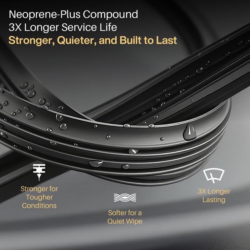 • 【Quiet Blade, Smooth Operation】Tired of screeching sounds every time your wipers move? Our windshield wiper blades are crafted with a premium neoprene rubber compound that absorbs vibration and glides smoothly for near-silent performance. Whether it's a calm morning drive or a stormy highway run, our neoprene wiper blades deliver quiet, streak-free wiping. Wouldn’t you rather have a wiper you can’t even hear? Now you can.