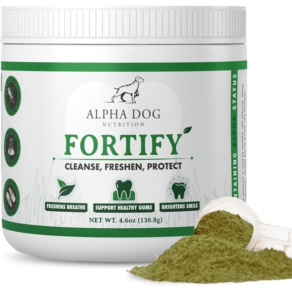 Dog Teeth Cleaning Powder - Fortify Dental Powder for Dogs - Effectively Removes Plaque and Freshens Bad Breath with Natural Green Ingredients - Features Kelp, Probiotics, and Additional Tooth-Cleansing Components.
