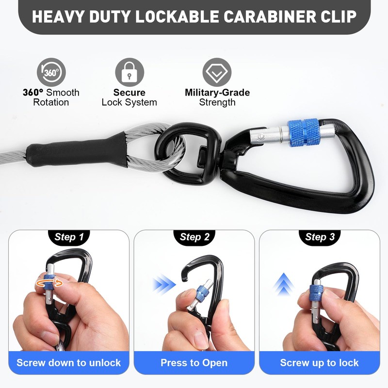 - Secure Locking Mechanism: The 360-degree swivel lock ensures no accidental openings, providing maximum security for your pets. The military-grade carabiner clip uses a screw-to-lock mechanism in just three steps, making it easy to install and use. The tangle-free design ensures safe and convenient playtime, even for the most energetic dogs
