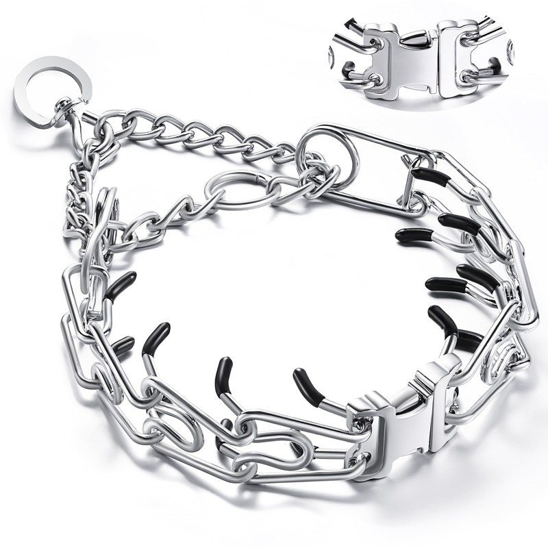 - 【100% Stainless Steel Reliable】This dog collar is made of high strength chrome plated stainless steel, this durable collar has a rust-free and water-resistant construction that will provide years of use. Smooth and round edge, combines with the rubber caps to bring double protection which will not cause harm to your pets. QUALITY ASSURANCE:If you have any questions about the product, please feel free to contact us so we will help you within 24 hours.