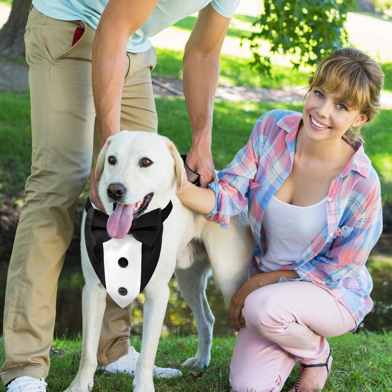- FORMAL DOG TUXEDO BANDANA: Give your furry friend a classy, dressed-up look with this elegant tuxedo bandana. Designed in classic black and white with a bow tie and button details, it's the perfect accessory for weddings, engagement ceremonies, birthday parties, or formal photo shoots.