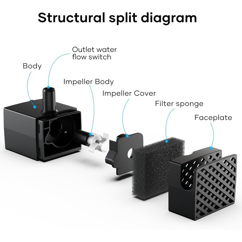 - If the pump suddenly does not work or the water flow becomes small during use, we recommend that you clean the pump first and wait patiently for a few minutes after filling it with water. After the internal air pressure is discharged, the pump will return to normal operation.