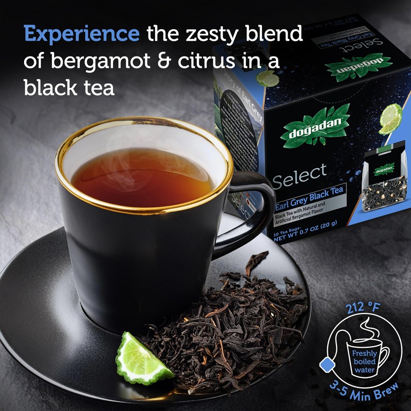 - Delight in the elegant, citrusy flavor of Dogadan Select Earl Grey Black Tea, the ultimate me-time treat. Simply bring water to 212 F, pour over tea bag and steep 3-5 minutes. Enjoy as-is or sweeten to taste.