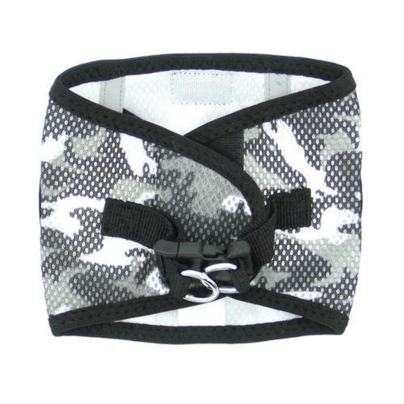 Hit the trails and blend into your environment with this fun American River Camo Choke-Free Mesh Dog Harness in Gray. Camouflage design Double Safety Closure. Reflective strips for night walking. Fashionable embroidered logo. Patented design. Made of 100% polyester mesh. Machine washable. Why We Love It: The American River Choke-Free Mesh Dog harness in Gray Camo is a great choice for dogs wanting to look outdoorsy and a little tough. But this fashionable harness isn't just for looks. The American River Choke-Free dog harnesses by Doggie Design are simply head and shoulders above the rest for quality and safety. Why? Trachea safe - The Choke-Free patented design pulls only from the chest, never the neck. Many smaller breeds are susceptible to having a collapsed trachea, especially when using a collar. Even regular harnesses can be dangerous for toy and teacup breeds. Don't put your pup's airway at risk with anything but a choke-free harness! Patented Conforming Shape Fit Seam Technology - This unique feature allows the harness to conform to curves even on hard-to-fit dog chests. Patented Closure Slide Adjustability - Most harnesses have little or no size adjustment at the clasp. This unique design allows the clasp to slide along the nylon webbing for a full 3 inches of adjustment. Double D-ring - Most harnesses have only a single D-ring. Furthermore, some companies use D-rings that aren't welded shut. The remaining slit in the metal of sub-par D-rings may open under pressure and the nylon could slip out, leaving your dog at risk for escape. Since the American River Choke Free Harness features two welded D-rings in its design, you're getting double the protection. Reflective strips - All of the colors of American River Choke-Free Dog Harnesses feature reflective strips that can be viewed from the front and the sides to provide visibility during nighttime or early-morning walks. Zig zag trim binding stitch - Using a zig-zag stitch over the harness t