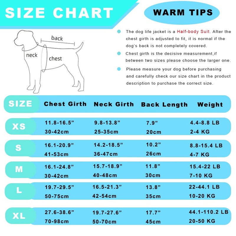 - SIZE CHOOSE & NOTICE:Dog life Vest are HALF-LENGTH clothing, Chest girth is the decisive measurement, Please measure the deepest part of the dog's chest, If between two sizes, please choose the larger one. It is recommended that you unpack the courier and press it a few times with your hands in the opposite direction of the fins. so that the fins will be more erect and the dog will wear it more perfectly