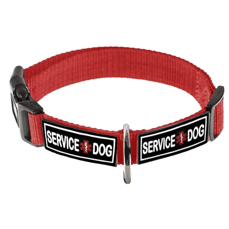 Dogline Omega Nylon Collar for Dogs with 2 Removable Service Dog 3D Rubber Patch Patches (Red, 14"-18")