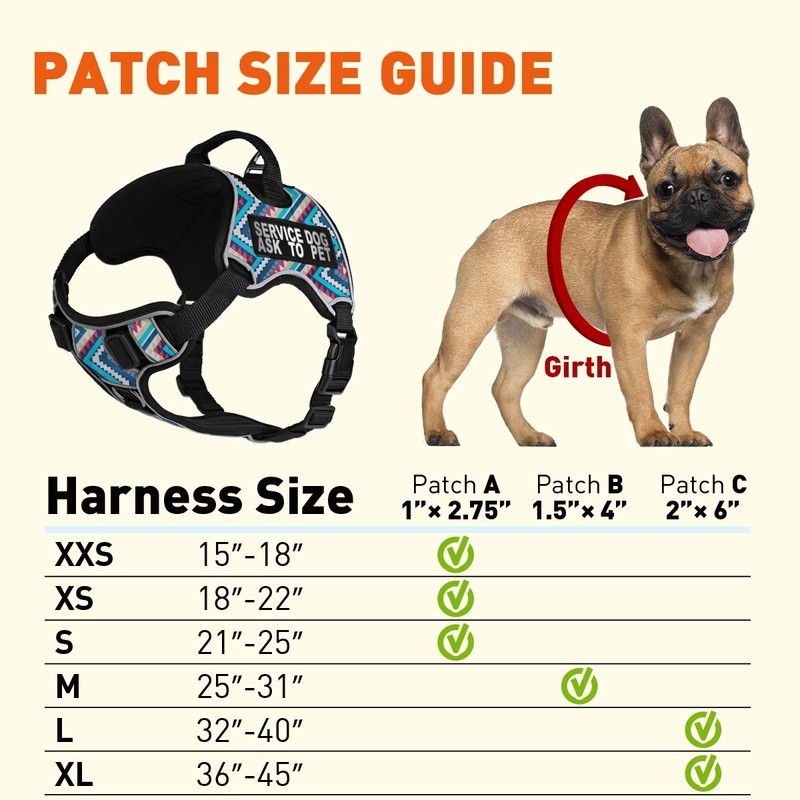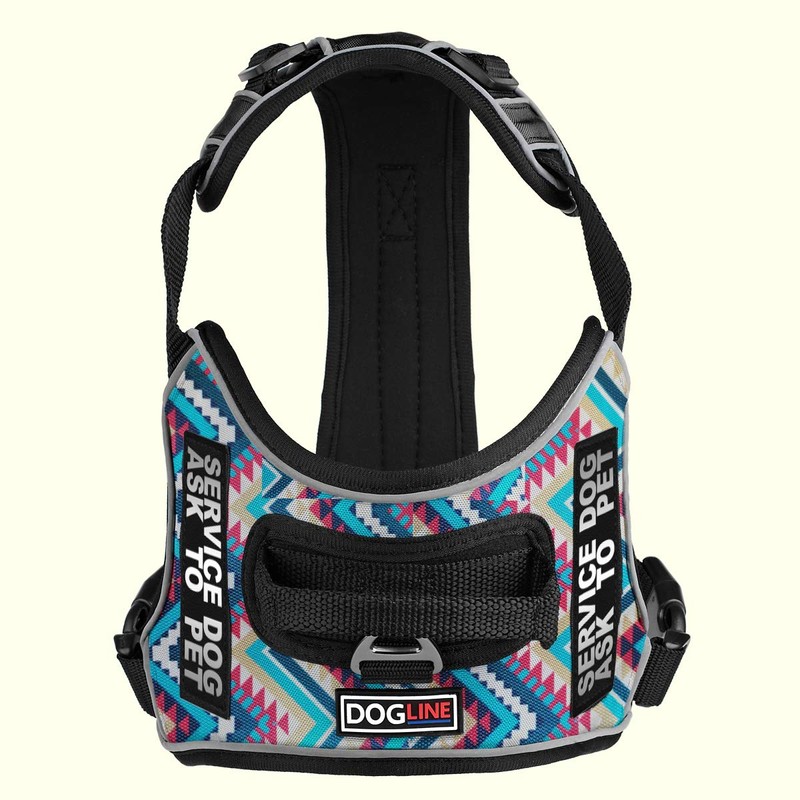 Dogline Quest No-Pull Dog Harness with Service Dog Ask to Pet Reflective Removable Patches Soft Comfortable Dog Vest with Quick Release Dual Buckles Black Hardware and Handle 25 to 31 inches Aztec