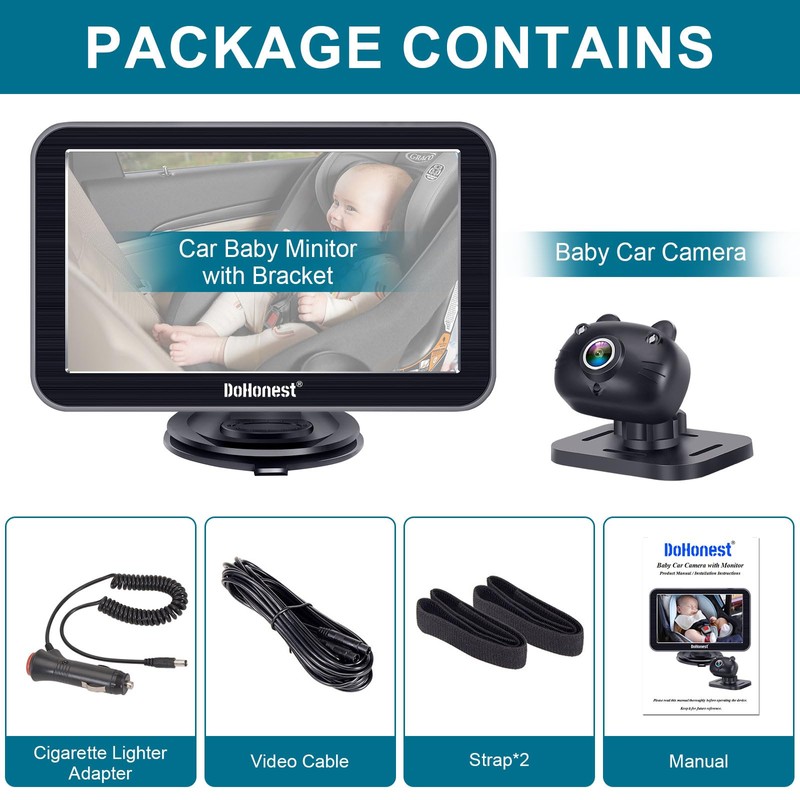 Included Components:1* Baby Car Video Cable, 1* Baby Car Lighter Adapter;2* Straps, 1* Baby Car Suction Cup;1* USB Power Cord, 1* 7 Inch Baby Car Monitor, 1* Baby Car Camera