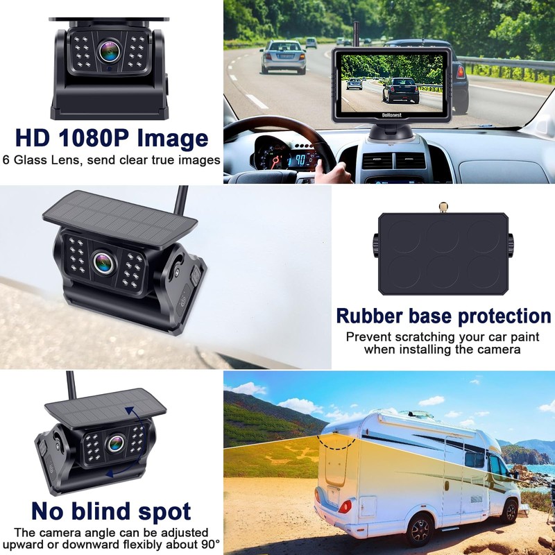 - Solar-Powered & Rechargeable Battery for Long-Lasting Use: Featuring solar power for continuous charging and a 9600mAh rechargeable battery, this backup camera offers up to 24 hours of use on a single charge. Perfect for long road trips, reducing maintenance and eliminating the need for constant recharging, ensuring you're always ready to go.
