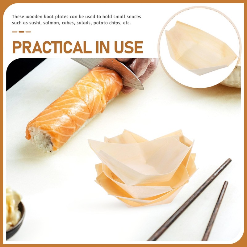 DOITOOL 100pcs Disposable Wooden Boat Natural Pinewood Take Out Trays Sushi Boat Shape Plate Sushi Sashimi Christmas Serving Plate (3.3"×2.4")