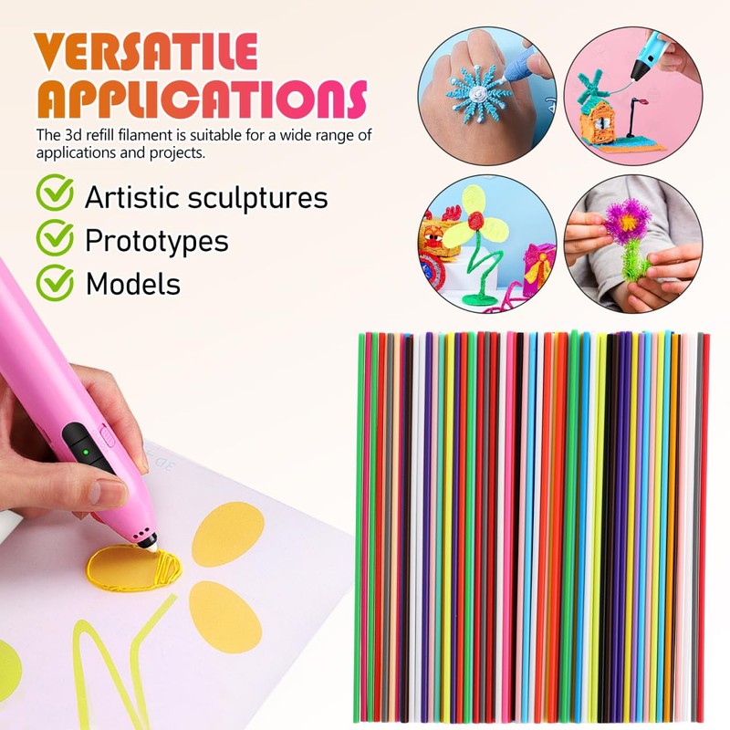 • PCL 3D Pen Filament Refills --- Our 3d pen filament refills are made of PCL material, safe for children and adults. The filament for 3D printing pens is available in a wide range of vibrant colors, allowing you to bring your imagination to life