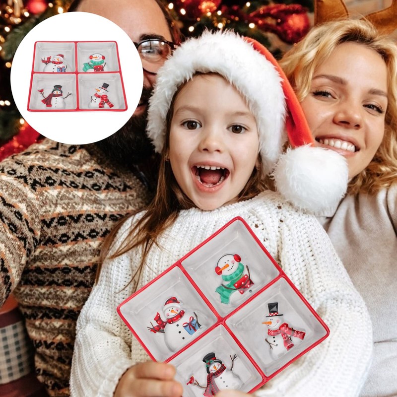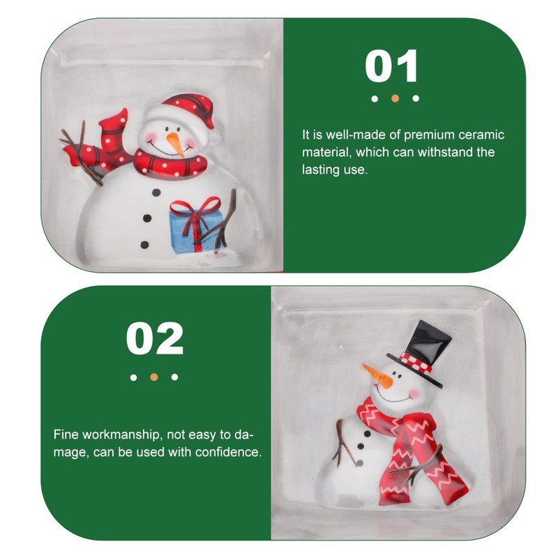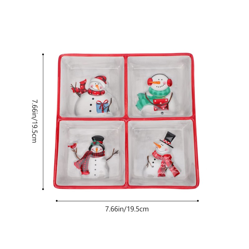 - Christmas Snowman Serving Dishes --- This Christmas serving plate is printed with 4 different Christmas snowmen. The appearance can greatly increase the Christmas atmosphere of this dinner plate