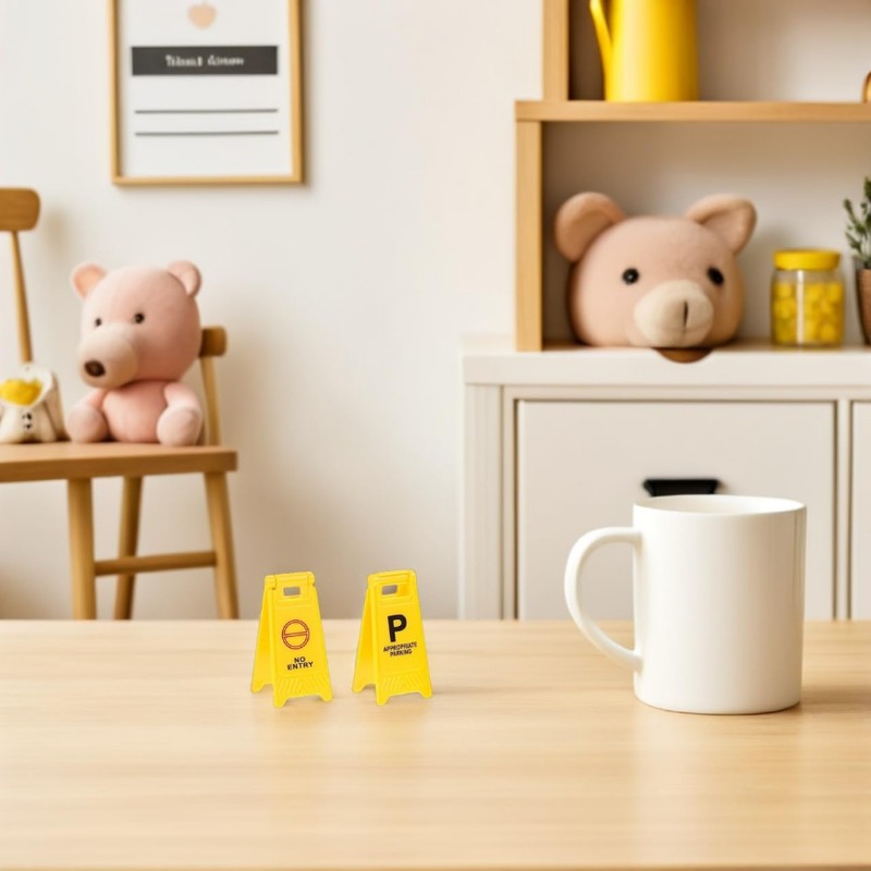 Mini Traffic Signs Set --- Package including 8 yellow warning signs, 12 mini red traffic cones, and 5 mini trash cans, portable, easy to carry