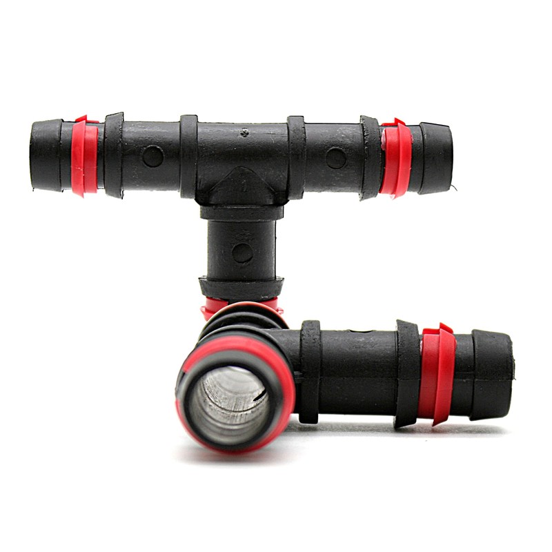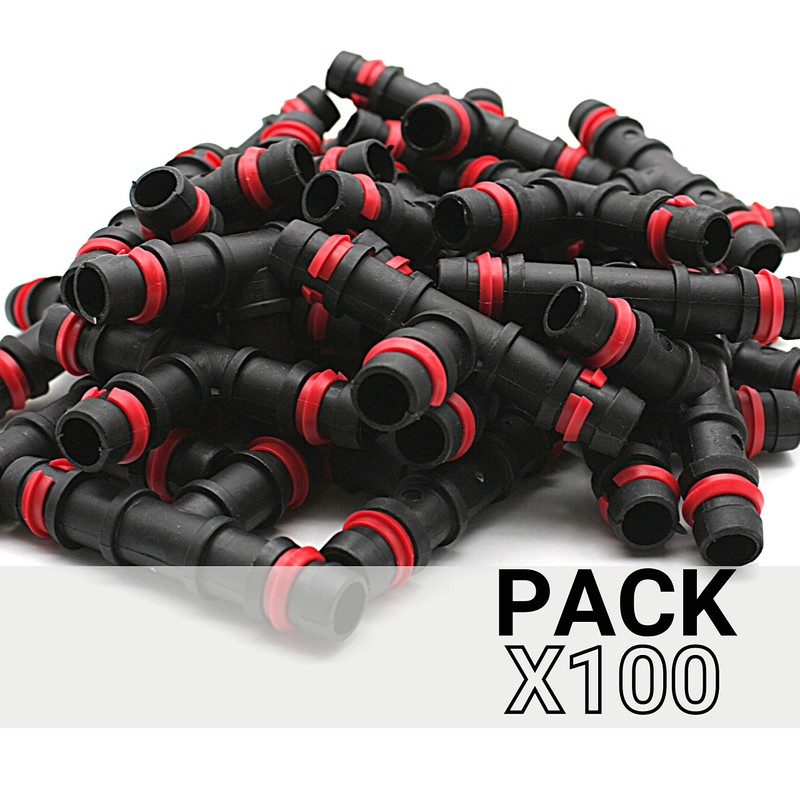 - Pack of 100 16mm safety tees. T-hose splitter with safety rings. Used in high pressure drip irrigation systems. Colour: black with red rings. The circlips hold the part on the irrigation hose, so you get safe installation and good performance. Create a watering program and set it yourself.