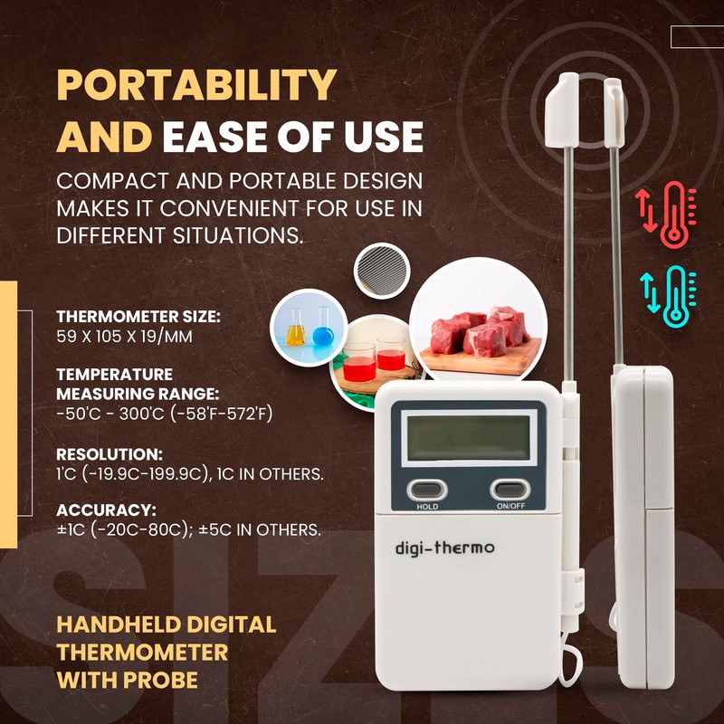 - Are you looking for a digital thermometer with probe for temperature measurement? A digital handheld thermometer with probe is a portable temperature meter consisting of a main unit and a probe connected via a cable. The probe has a sharp or pointed end used for temperature measurements in a variety of applications.
