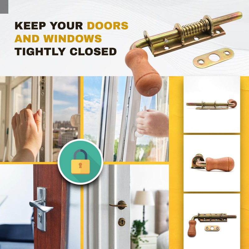 - Pack of 1 spring loaded bolt for door latches. Colour: gold. Size: 195 x 95 x 50 mm. Weight: 0.212 kg. Zinc Plated Finish The lock bolt is equipped with a wooden handle that prevents slipping during use and makes it easier to use. With its compact design and solid construction, the door latch is a welcome addition to securing your home. Expand your door accessories with our robust, spring loaded latch!