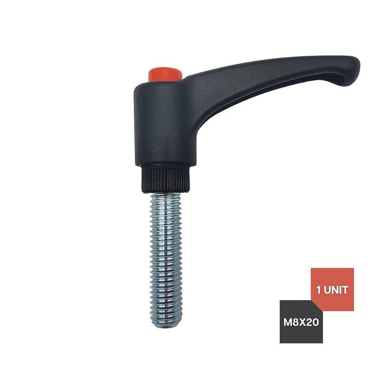 - Toggle screw M8 | 1 unit | colour: black handles | external thread buttons | dimensions: height 29.5 - length: 52 - width: 16 - num. Teeth 18 - Screw height 20 - Num. Teeth 20 | Other names and uses of the product: replacement handle for metal lathe, tension lever m8, toggle nut m8, m8 knobs, lever screw m8, m8 clamping lever, m8 adjustable handle