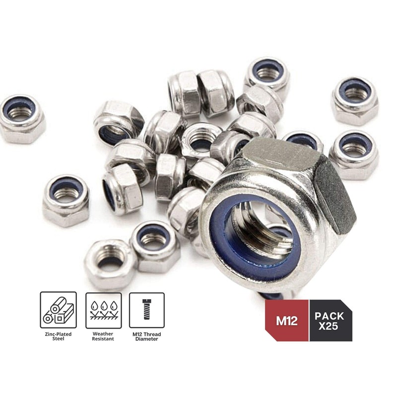 - The self-locking hex nut kit is made of galvanised steel to provide the highest quality and durability over time, similar to stainless steel. Thanks to its high-quality material, the hex nut resists weather, moisture and rust. In addition, the nylon insert can provide the required resistance in case of high vibrations. Available in various sizes and quantities: m4 nut, m6 nut, m8 nut, m10 nut, m12 nut.
