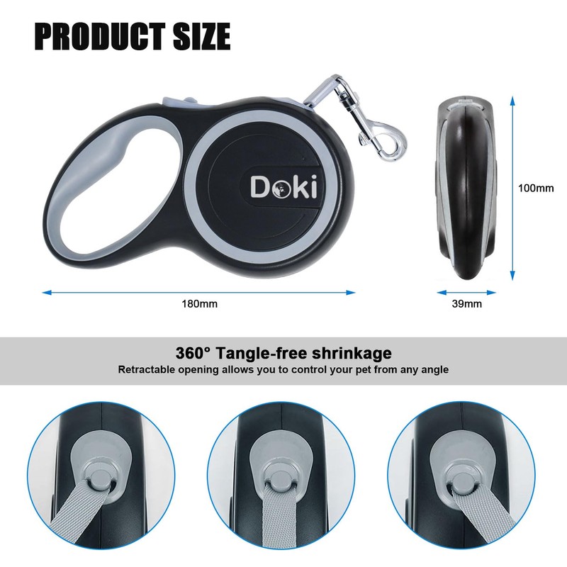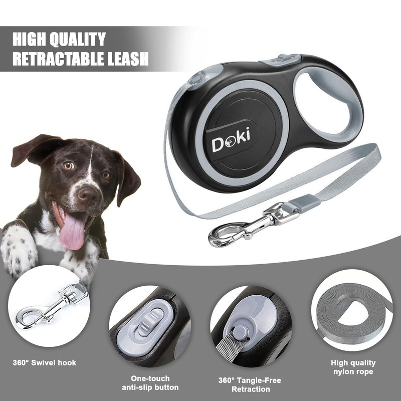 DOKI Retractable Dog Lead, 5m/16FT Reflective Strong Nylon Tape Ribbon Leash, One-Button Brake&Lock Extendable Dog Lead for Small Medium Dogs (Grey)